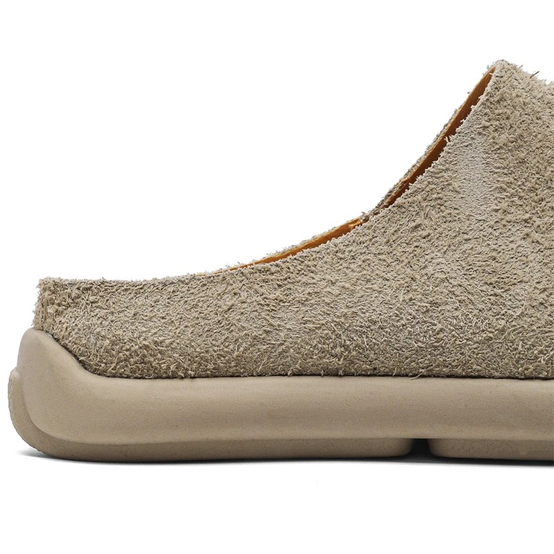 Discover breathable British-Style Summer Suede Mules for men and women. Originality™ unisex slip-on outdoor slippers in khaki and brown with rubber sole and PU insole. Perfect for daily casual wear.