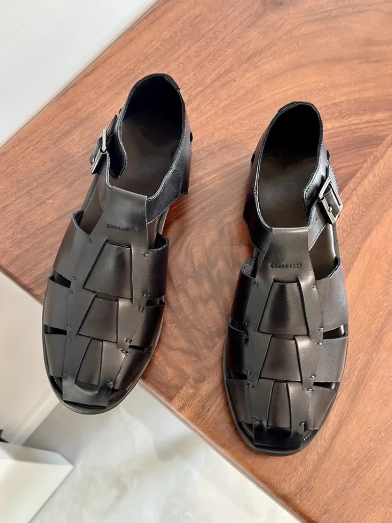 mens woven leather gladiator sandals, handmade close-toe leather flats, UNITYPUREMAX buckle sandals, vintage breathable cowhide sandals, summer casual leather footwear men