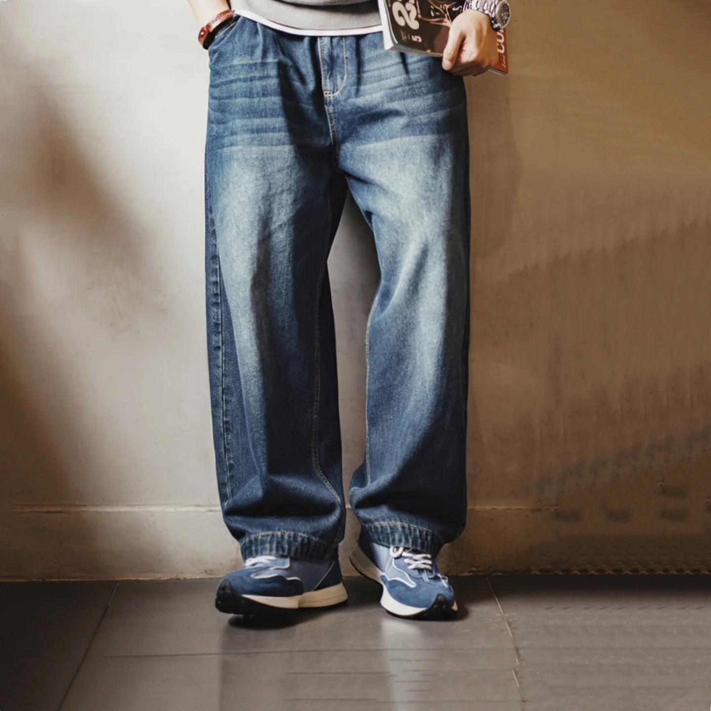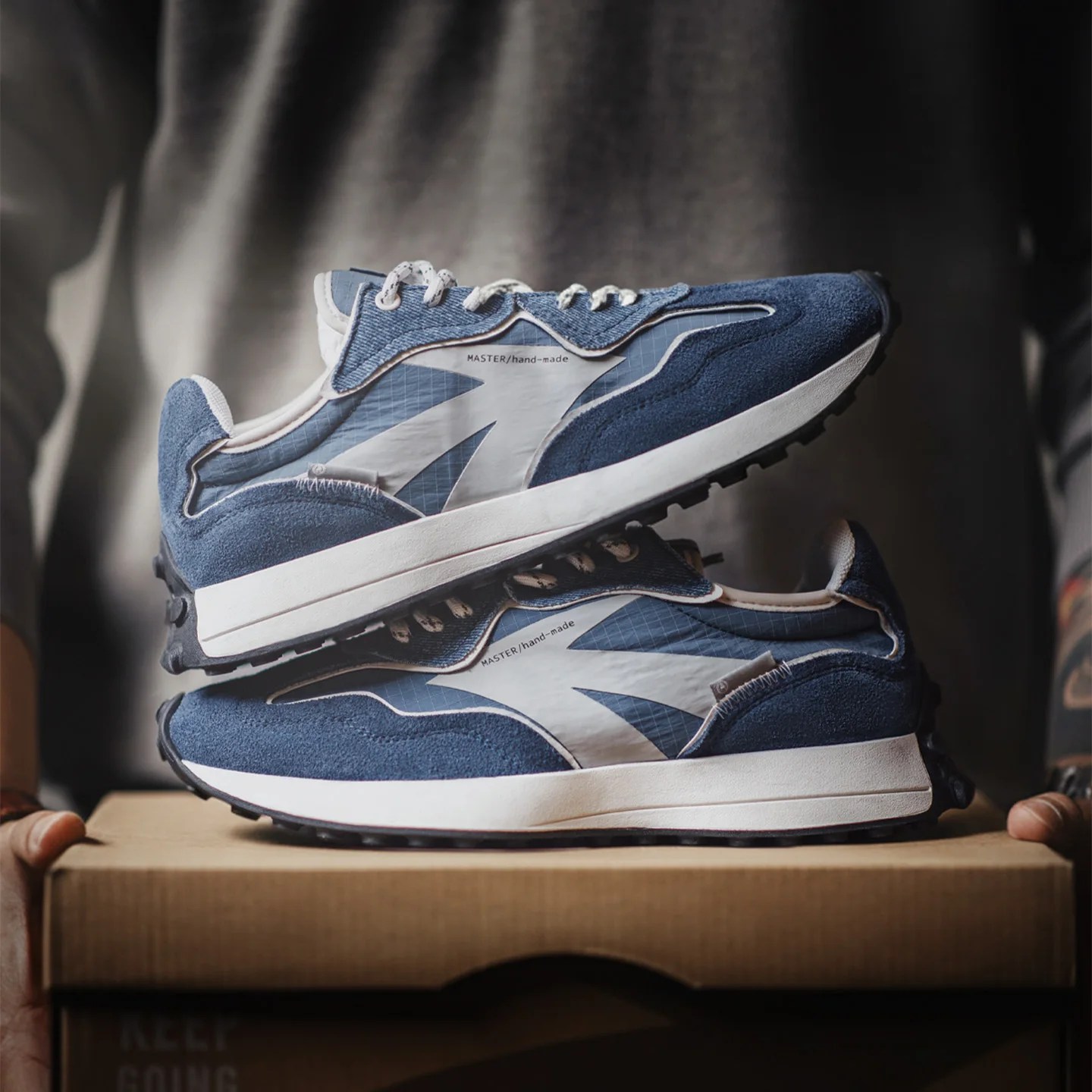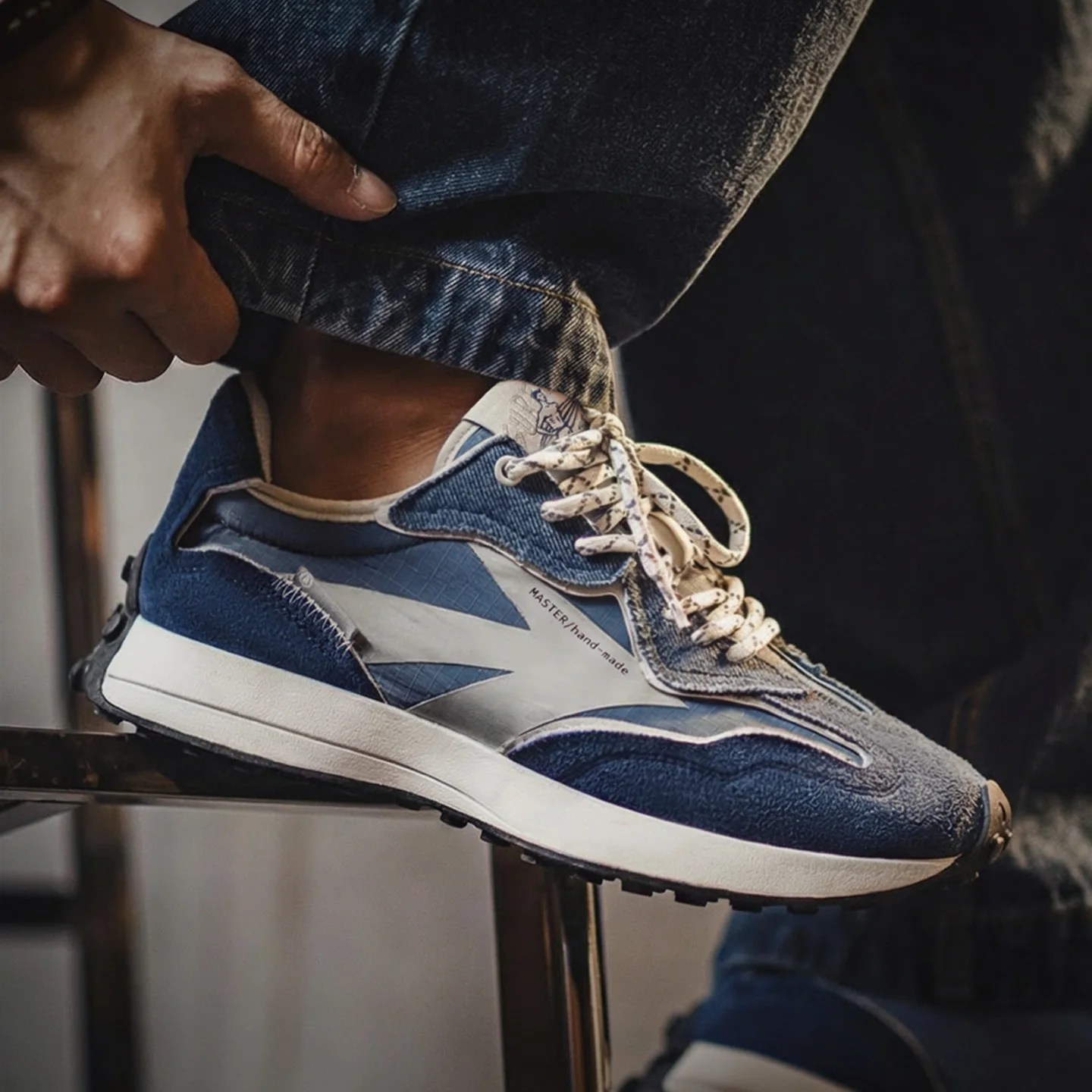 men’s retro denim sneakers, 70s style joggers, patchwork athletic shoes, breathable casual sneakers, dad shoes style, EchoStride footwear, blue suede trainers.