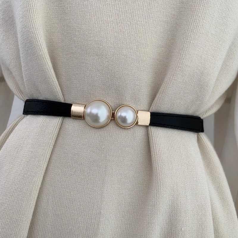 Elegant Double Pearls Belt for Women – Thin PU Leather Elastic Waist Strap