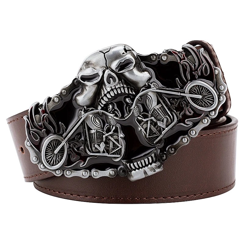 UNITYPUREMAX™ Fire Skull Motorcycle Belt for Men. Heavy zinc alloy flame skull buckle, adjustable PU leather strap, removable buckle design, and biker-inspired styling. Perfect for cruiser riders and bold casual looks.