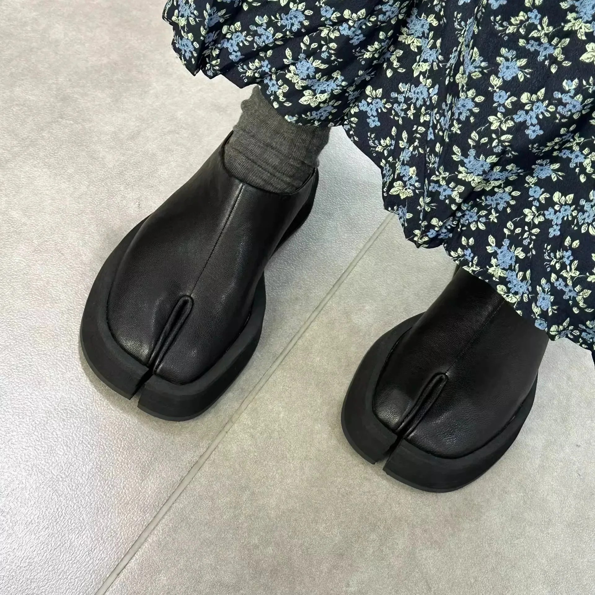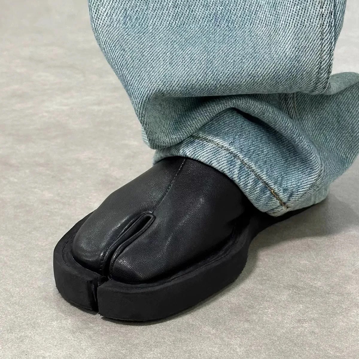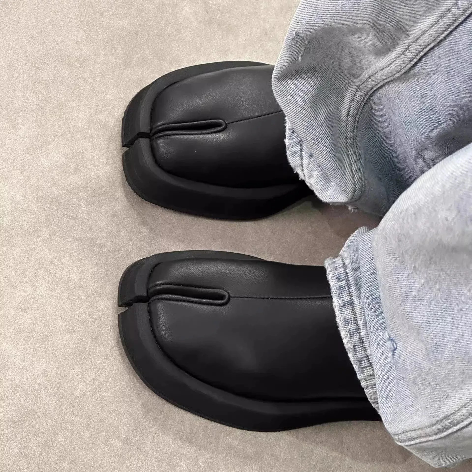 split toe mules, minimalist leather slippers, backless casual shoes, women’s flat heel mules, japanese style clogs, genuine leather insole mules, PU leather slippers, UNITYPUREMAX