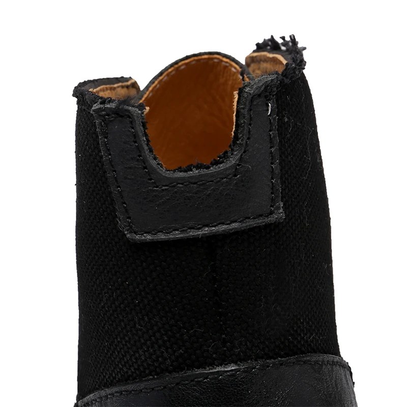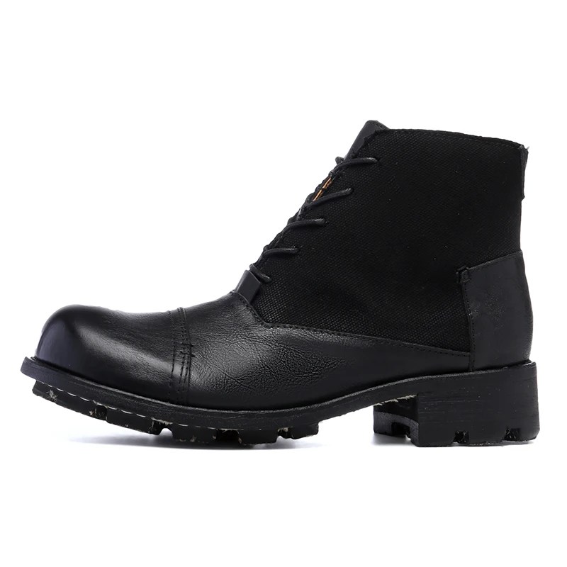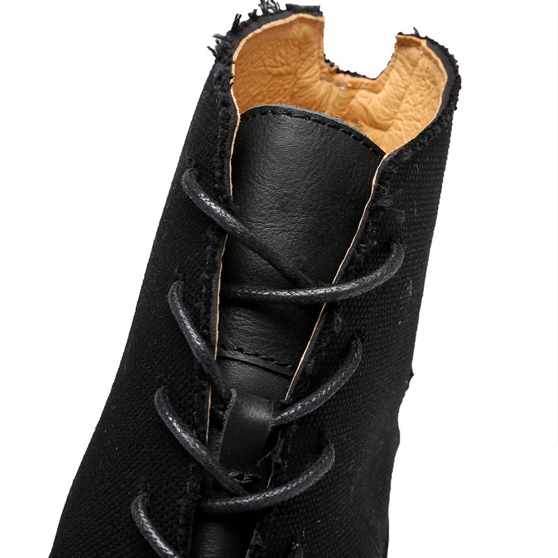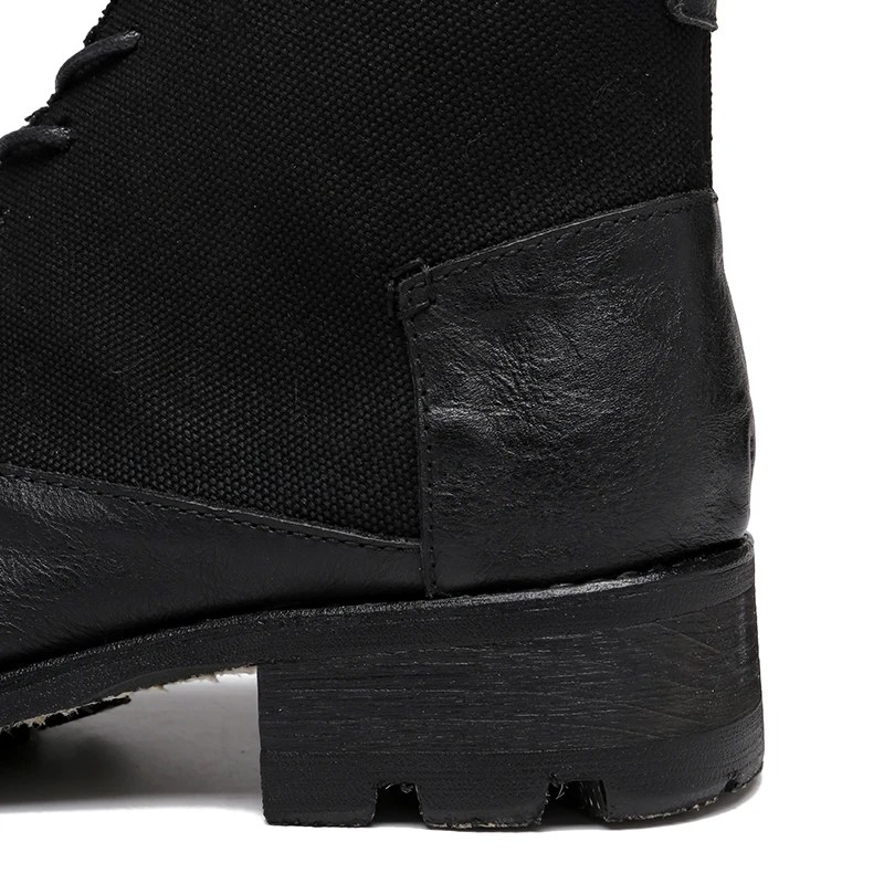 Handmade retro cowhide motorcycle boots with canvas shaft. Genuine leather lining, Goodyear-style finish, unisex lace-up ankle boots for winter street style.