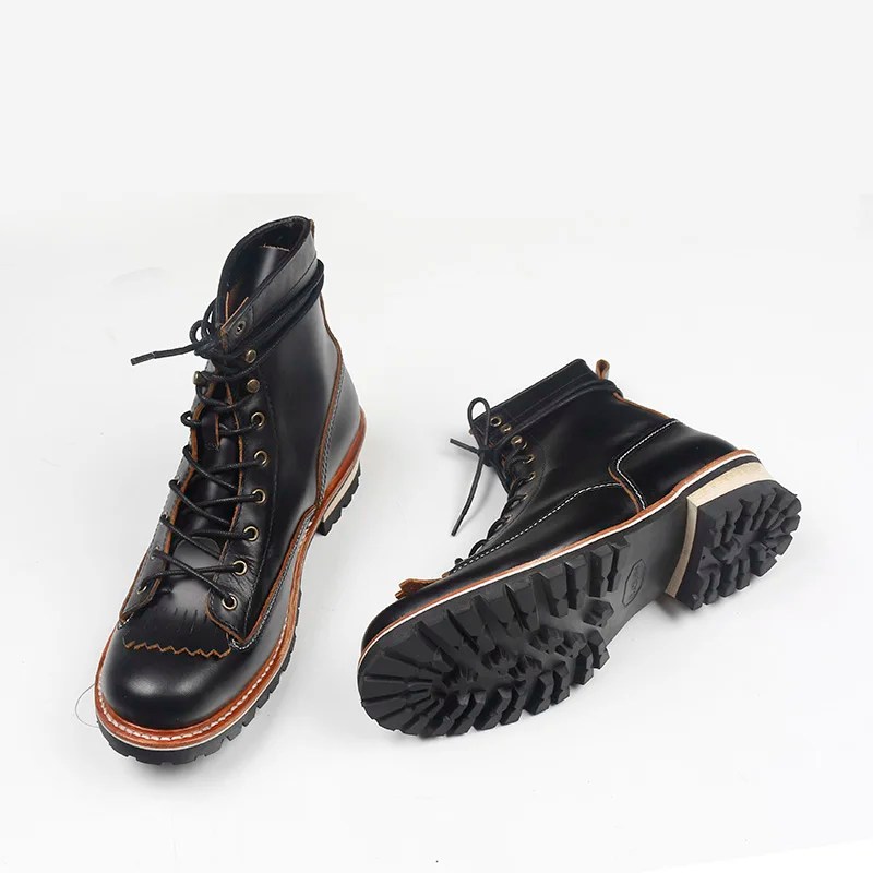 Steel sole shaping, copper eyelets, leather-and-rubber heel with steel nails.One-Piece Leather Tongue
