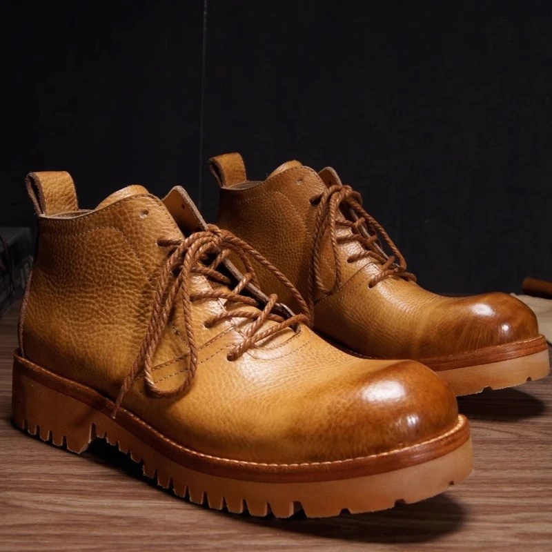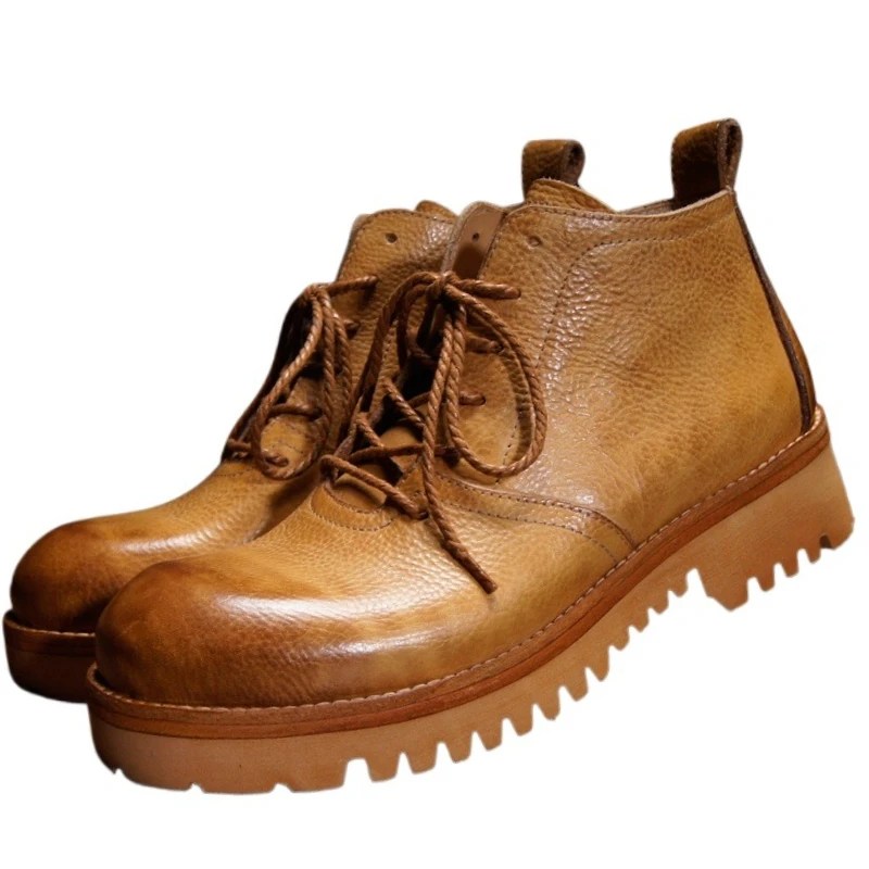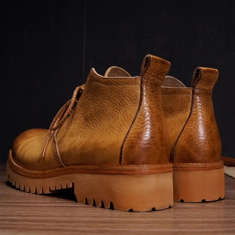 Shop luxury Hand-Sewn Retro Work Shoes in vegetable-tanned cowhide. Thick-soled, anti-slip motorcycle-style lace-up shoes with full leather lining. Unisex sizes 34–45.