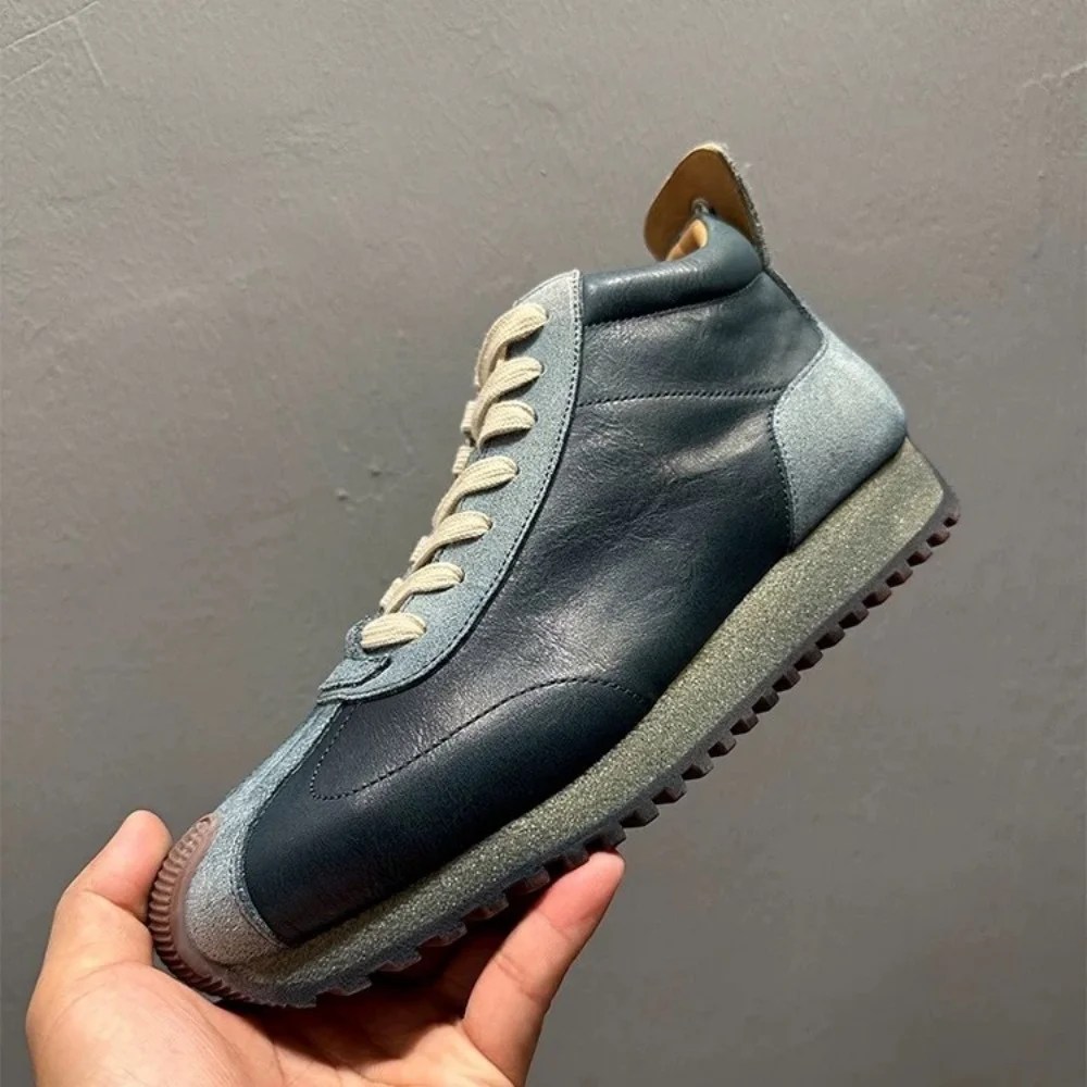 The SkyRise™ High-Top Sneakers are designed for men who demand both fashion and function. Handmade from premium cowhide leather, these sneakers feature a bold mid-cut silhouette with patchwork detailing, a breathable pigskin insole, and a supportive rubber outsole. The discreet platform construction not only delivers all-day comfort but also adds a natural height boost — giving you confidence with every step. Perfect for spring and autumn, SkyRise™ blends timeless craftsmanship with modern street-ready style.