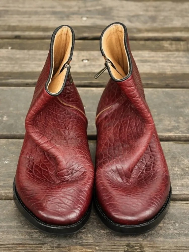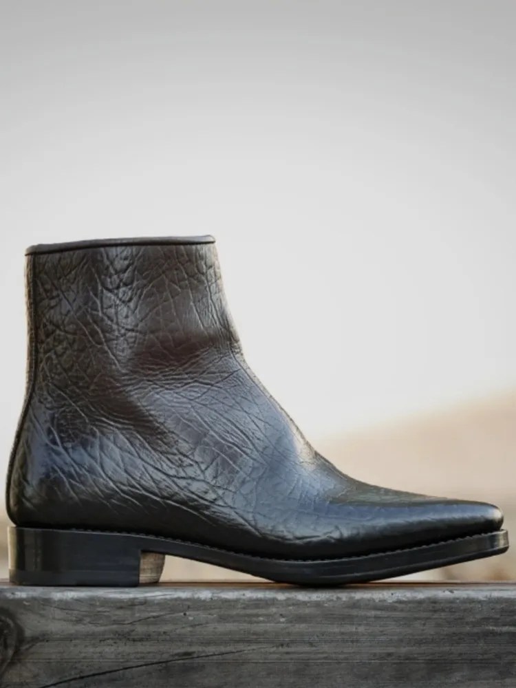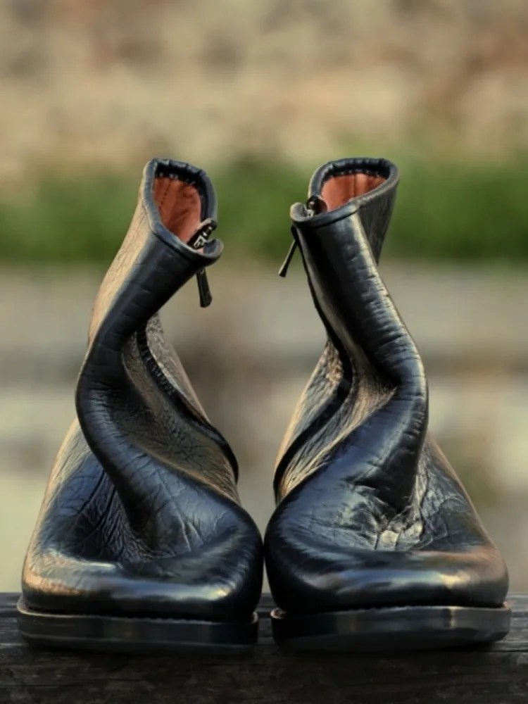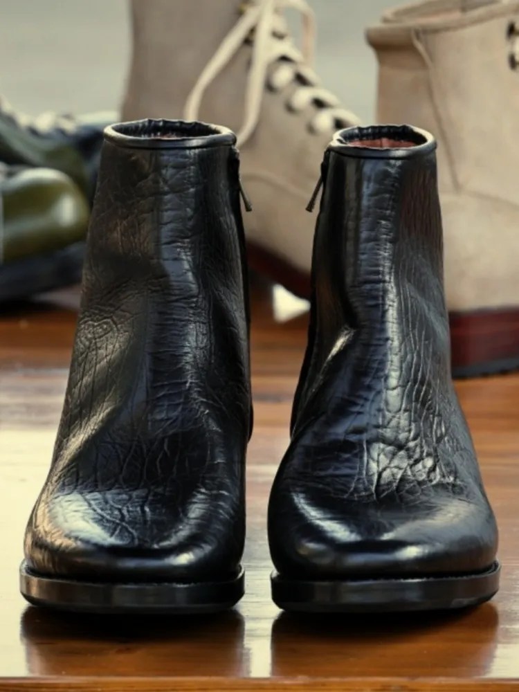Crafted from premium full-grain cowhide, these boots feature a clean, sculpted silhouette with a round toe and subtle platform profile. The side-zip closure ensures easy wear while maintaining a sleek appearance, and the genuine leather lining provides natural breathability for comfort across seasons.