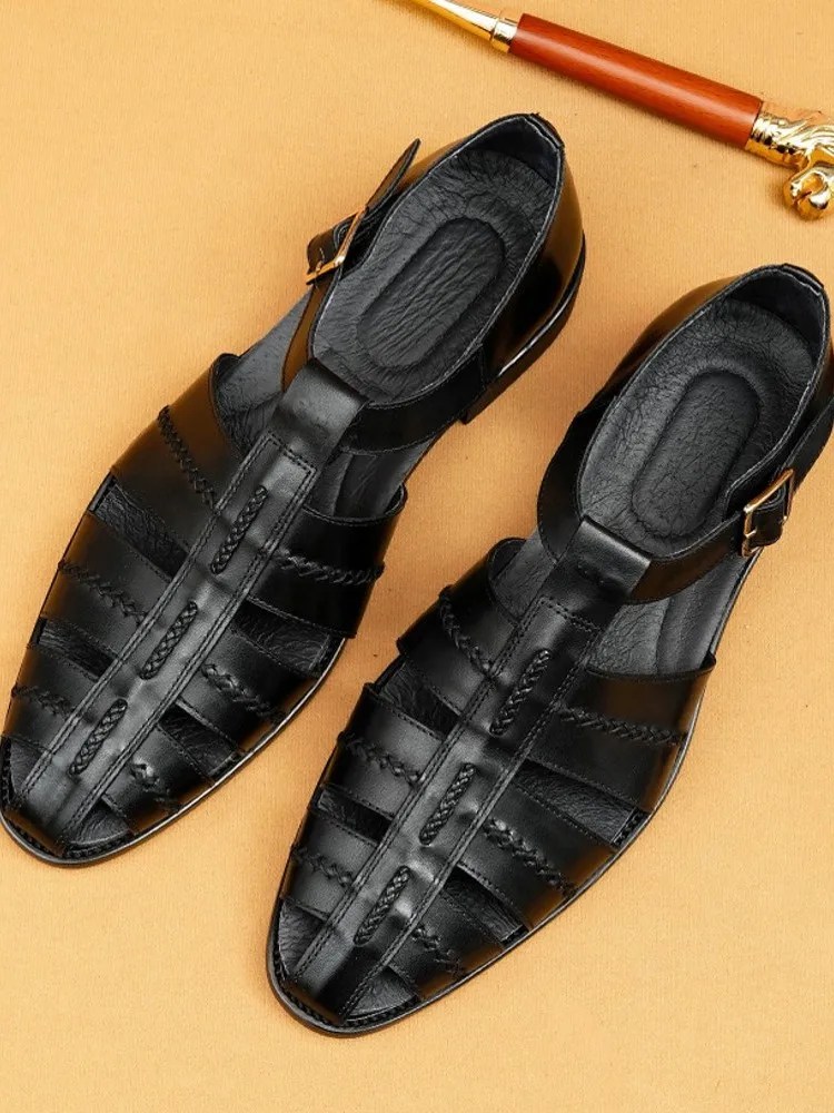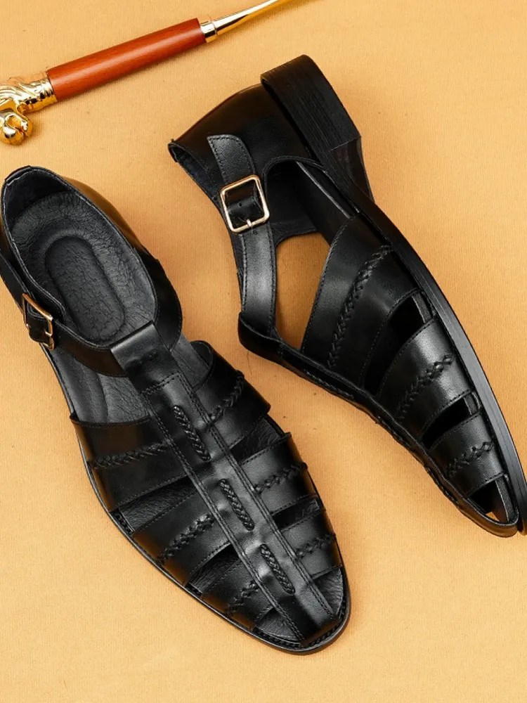 Handmade cowhide weaving gladiator sandals for men by UNITYPUREMAX™. Breathable hollow-out design with PU cushioning and buckle closure — perfect for work, casual wear, or summer comfort.