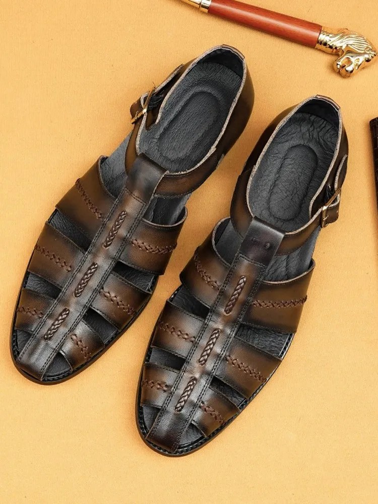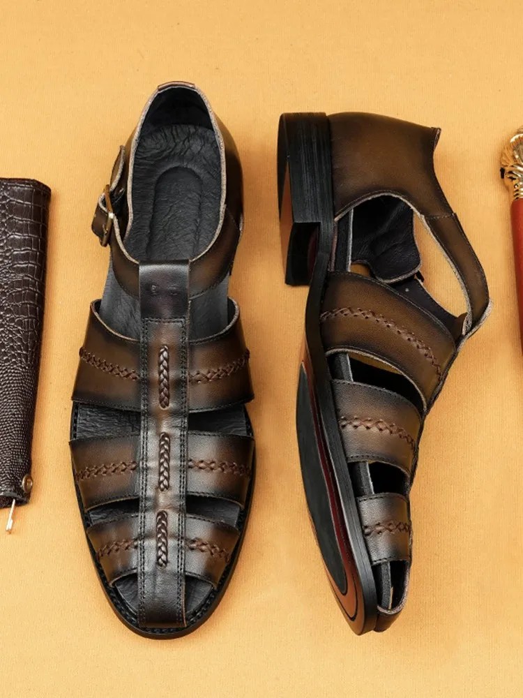 mens handmade gladiator sandals, cowhide woven leather shoes, UNITYPUREMAX work sandals, hollow-out vintage leather footwear, business casual leather sandals men