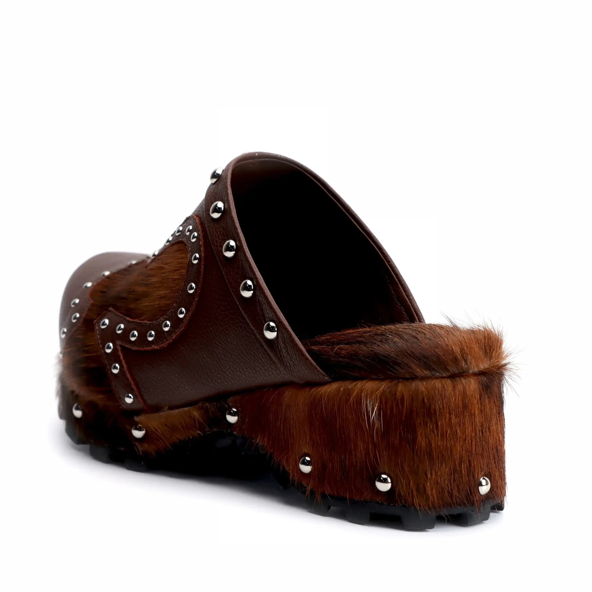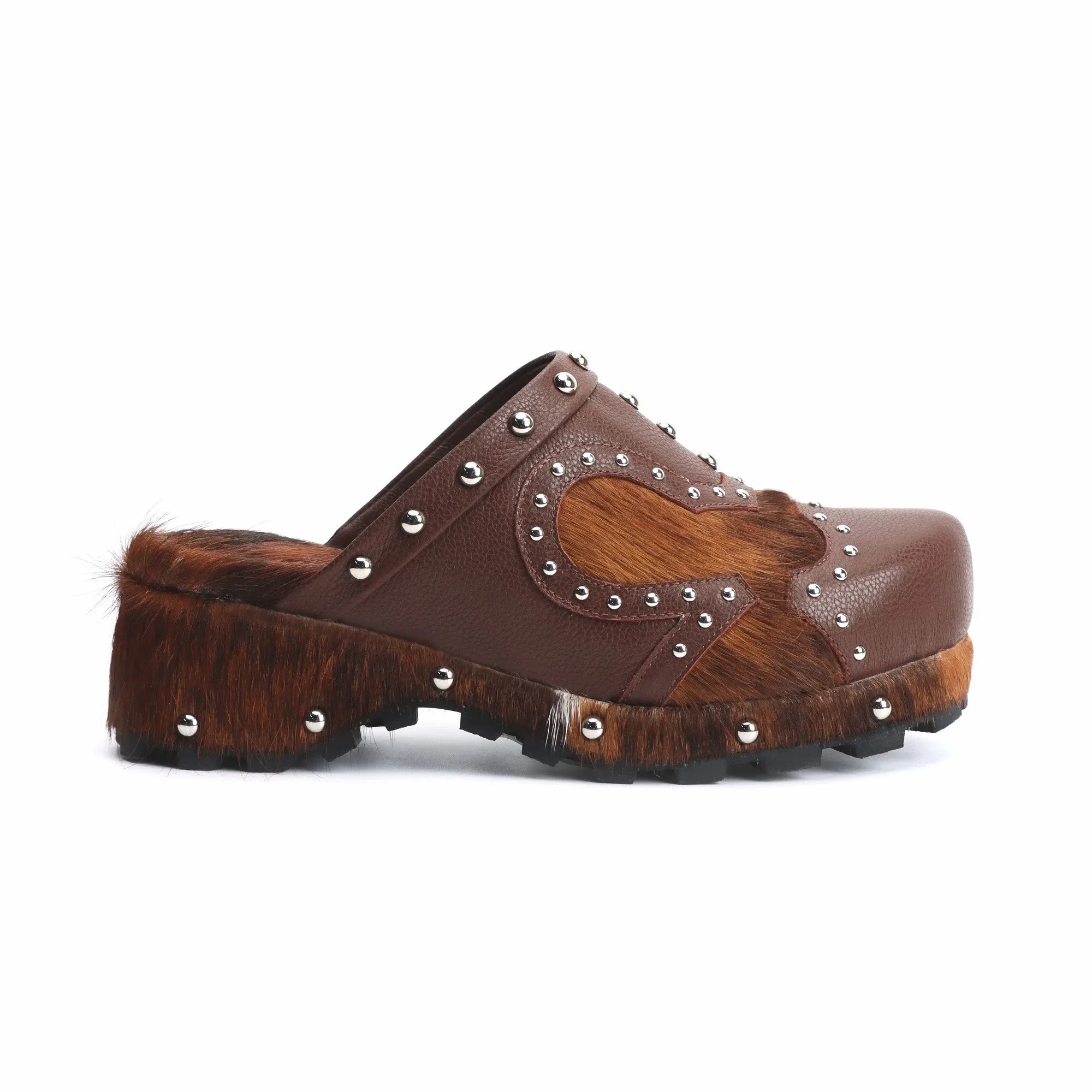 PureHiker fur clogs, handmade women’s mules, natural calf hair slippers, studded cowboy clogs, leather lined platform clogs, arch support slippers, vintage style women’s shoes, casual outdoor mules
