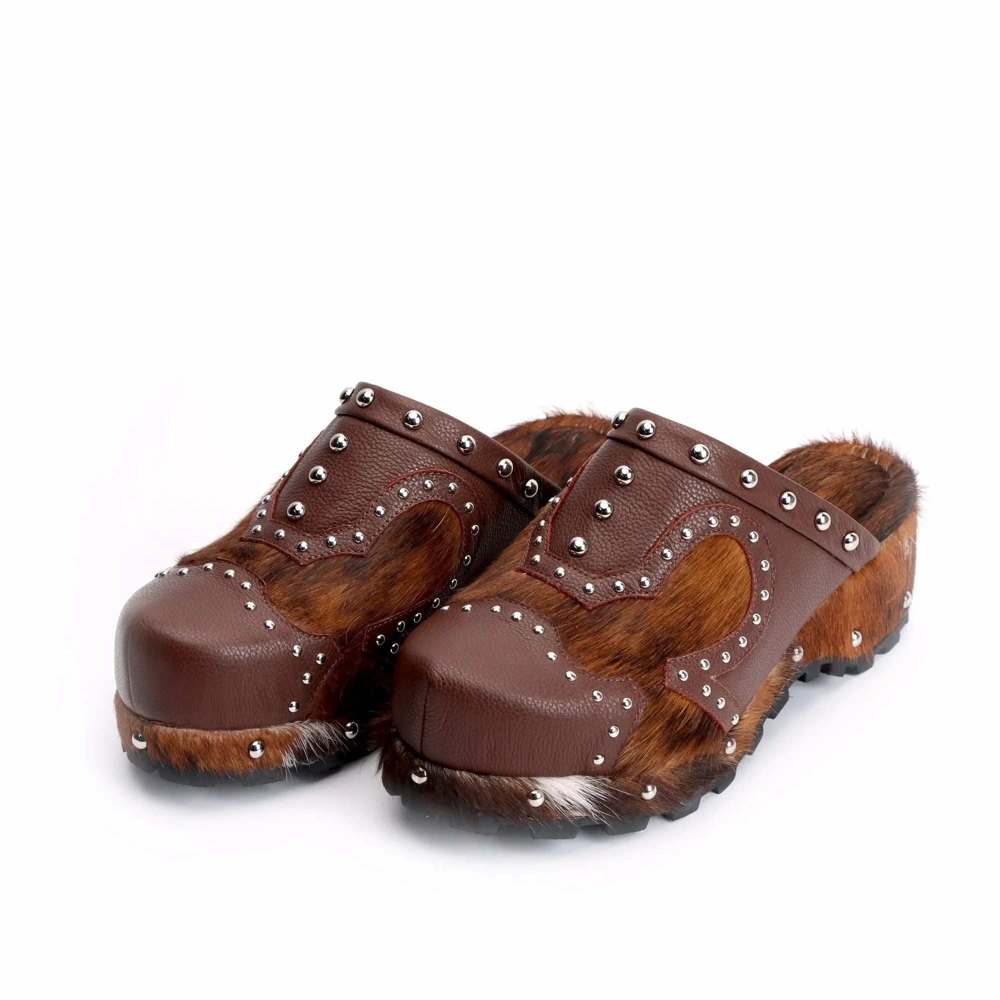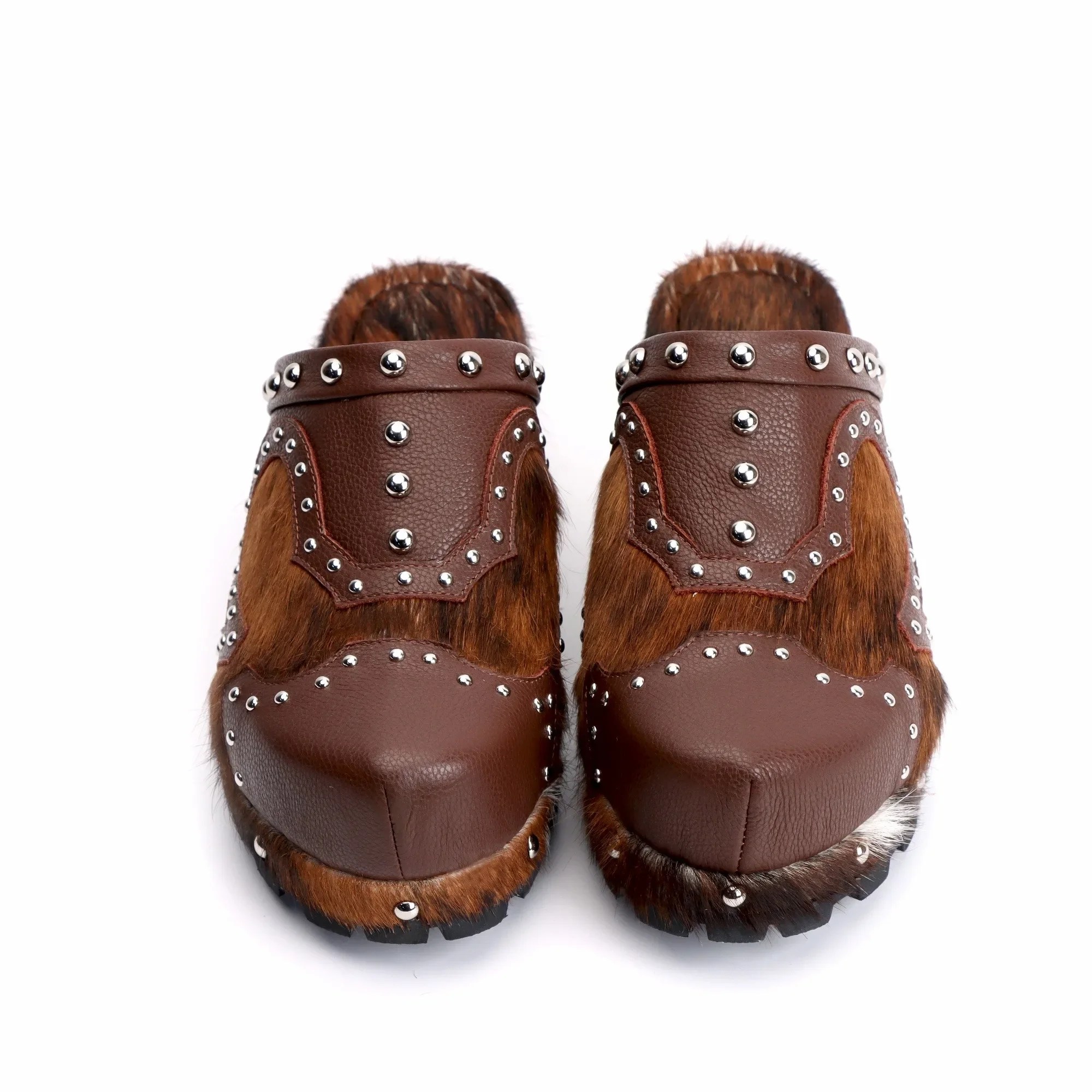 PureHiker™ Luxury Handmade Natural Calf Hair Fur Clogs – Women’s Natural Calf Hair Cow Leather Studded Mules with Arch Support