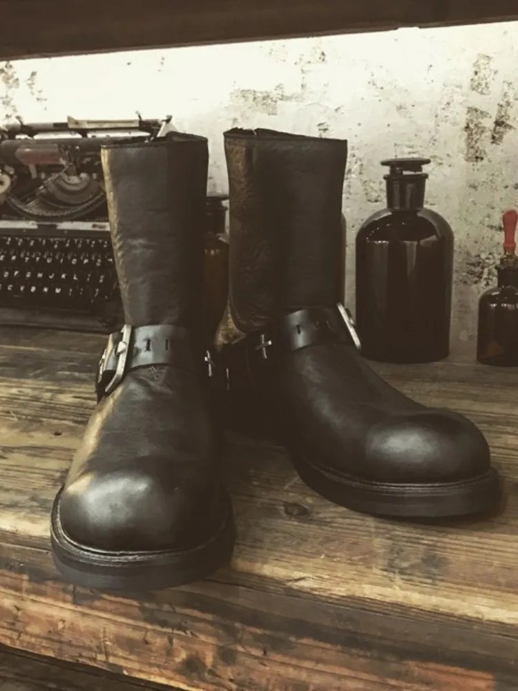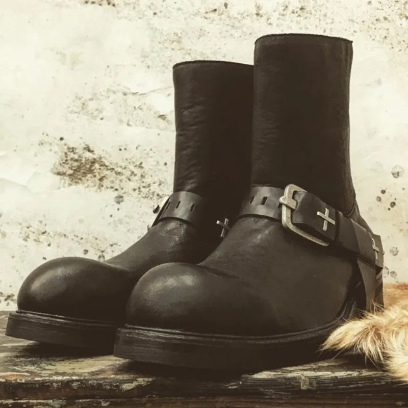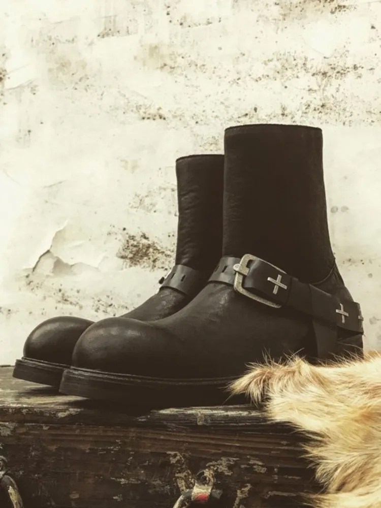 Handmade from genuine horsehide, these boots deliver natural grain texture and durability, paired with a platform lift that enhances height and stance. The slip-on zip design keeps the look sharp and streamlined, while the metal buckle detail adds a subtle industrial punch.