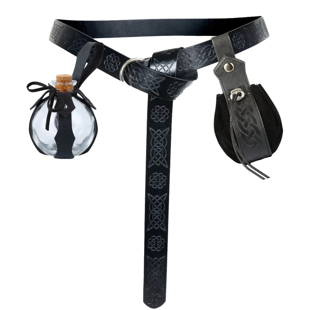 medieval leather belt, elf leaf belt set, cosplay magic bottle accessory, retro PU leather costume belt, UNITYPUREMAX festival belt, Halloween elf belt, embossed faux leather belt, medieval fantasy accessory, glass bottle costume prop