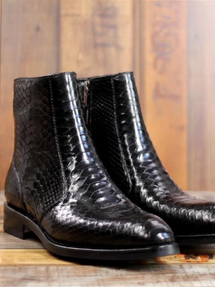 Premium men’s handmade snakeskin ankle boots. Pointed-toe, side-zip genuine leather design with refined modern silhouette and comfortable fit.