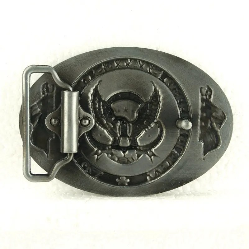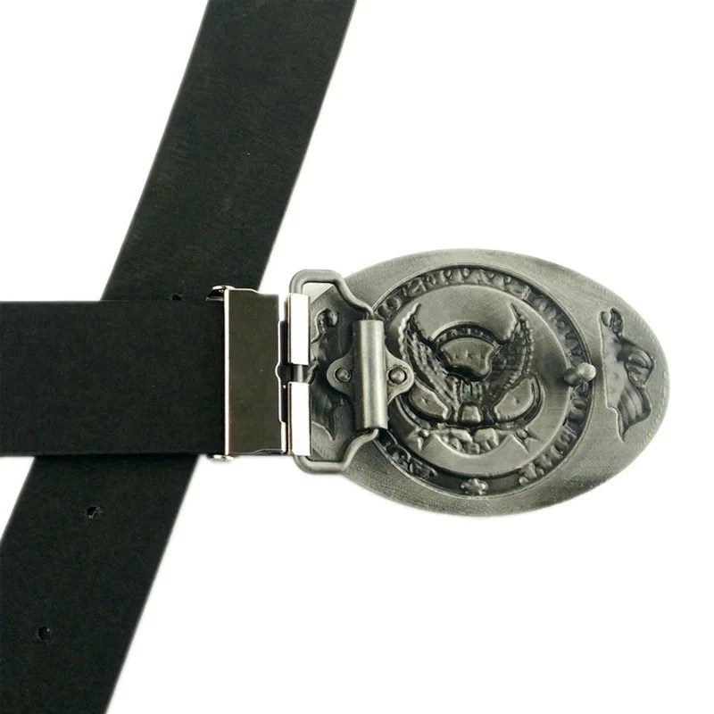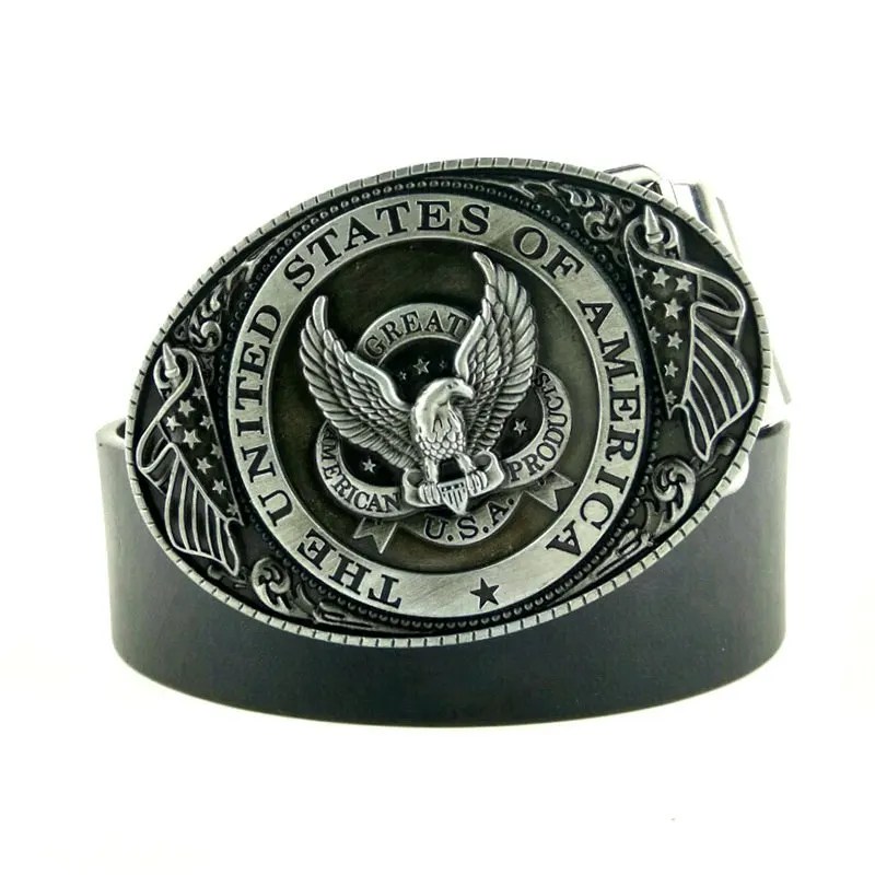 Large zinc-alloy eagle buckle (9 × 6.8 cm) showcasing detailed U.S. flag and animal-themed artwork.