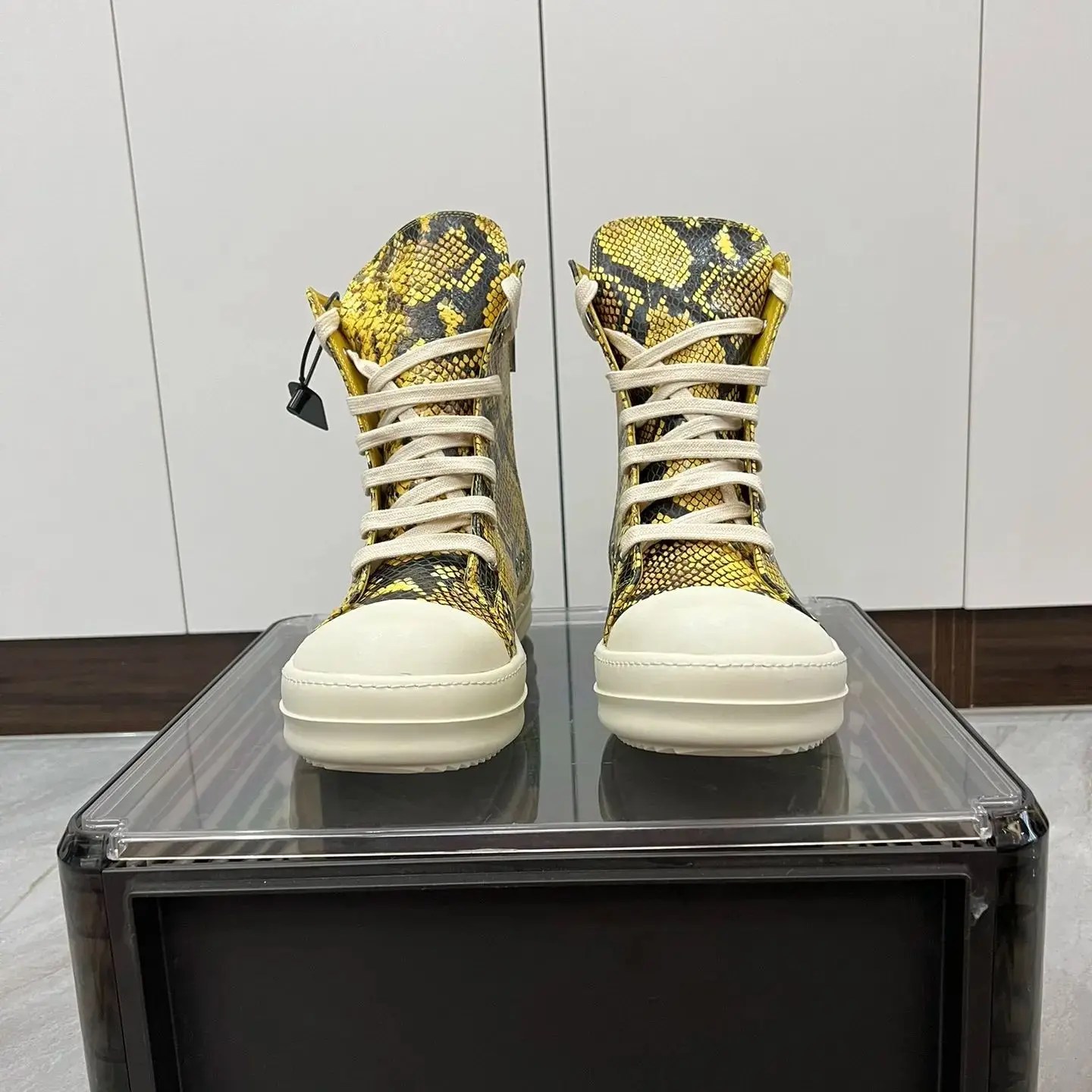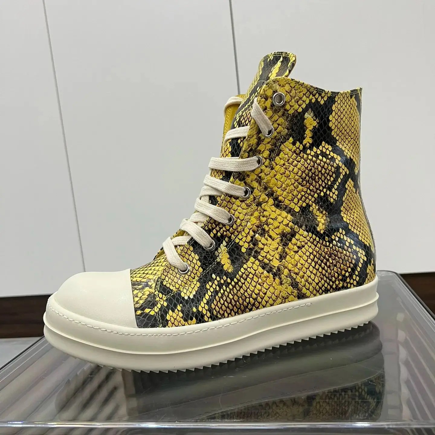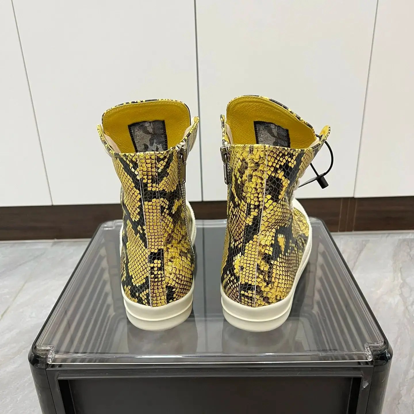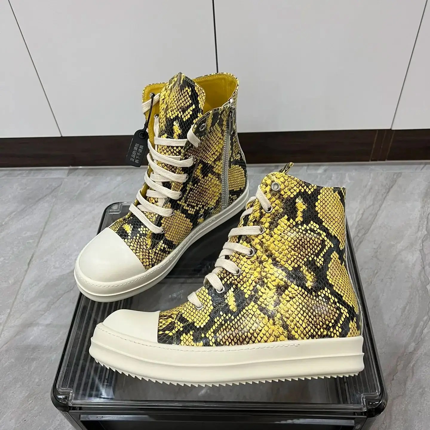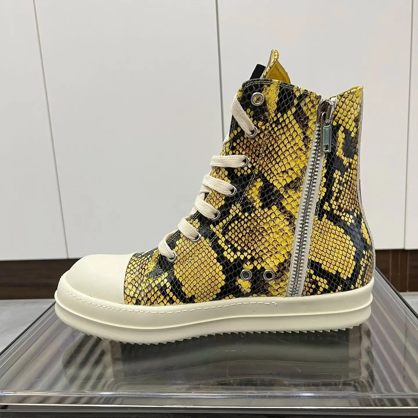 Handmade yellow python pattern leather high-top sneakers by UNITYPUREMAX™. Genuine cow leather, zipper lace-up design, unisex fit, height-enhancing insole, real photos.