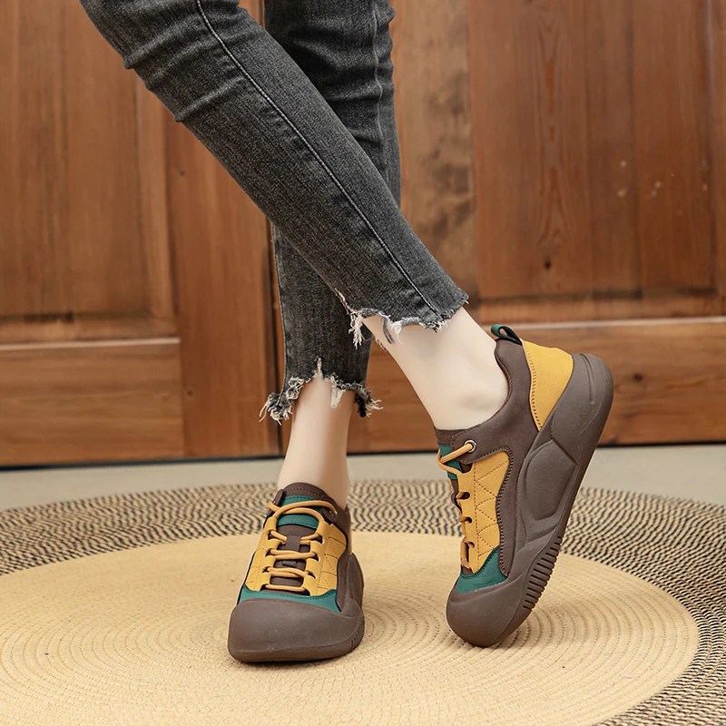 Shop the Originality™ Retro Color-Blocked Women Sneakers. Crafted with genuine split leather, vulcanized rubber sole, and vibrant mixed-color design. Sizes 35–43. Perfect for spring and autumn casual wear.
