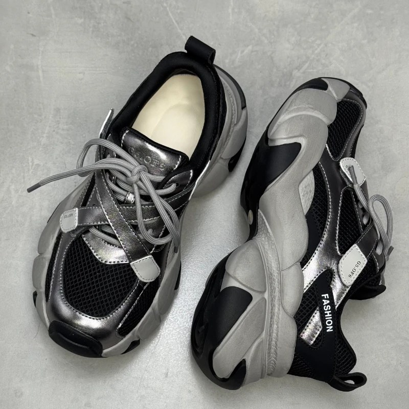 Step into modern retro luxury with the European/American Original Gun Color Retro Daddy Shoes for women by UNITYPUREMAX™. Designed for the confident woman who values both comfort and individuality, these sneakers blend breathable mesh with genuine cow leather in a multi-material spliced upper. The thick 6cm platform sole subtly enhances height while delivering exceptional comfort and support. With a vintage-inspired gunmetal color palette and sporty silhouette, these height-increasing shoes redefine casual elegance for spring and autumn wear.