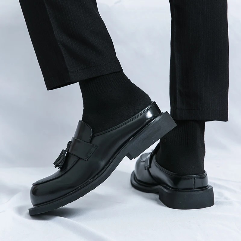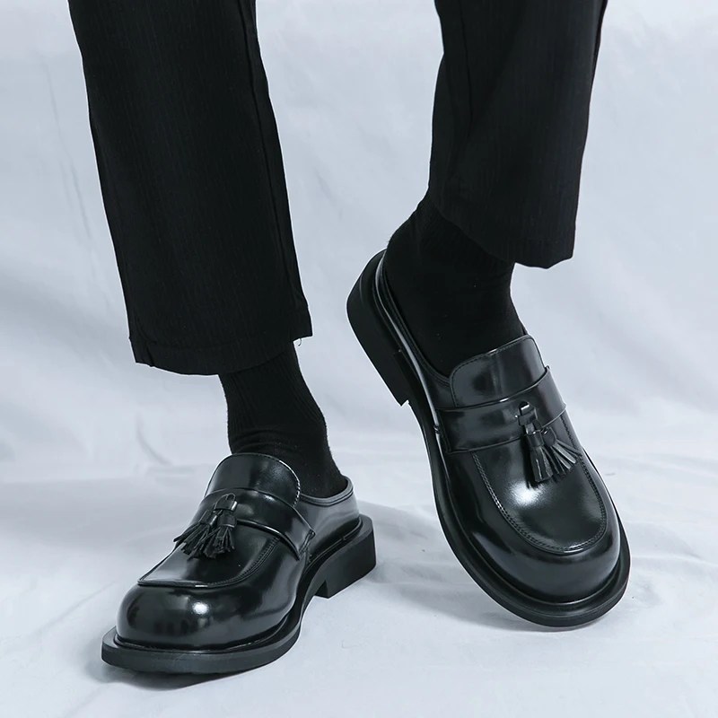 Summer Thick Bottom Leather Mules – Men’s Backless Tassel Loafers & Slip-On Slippers
