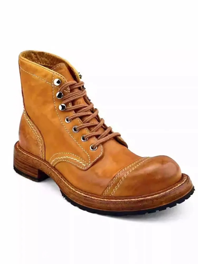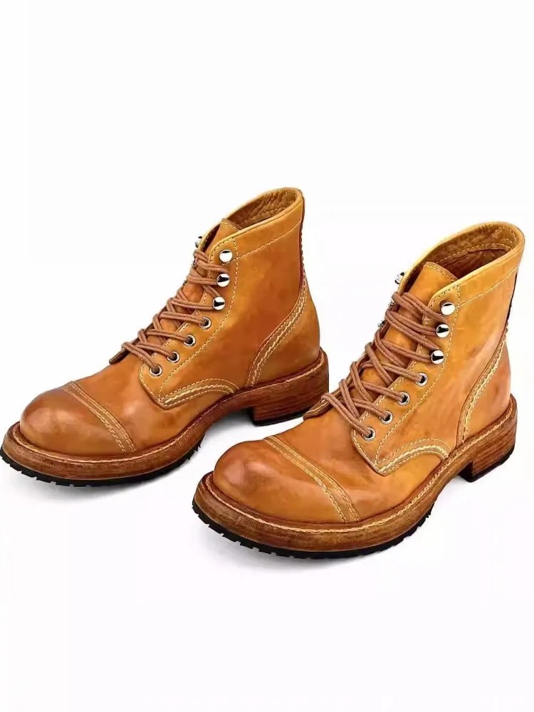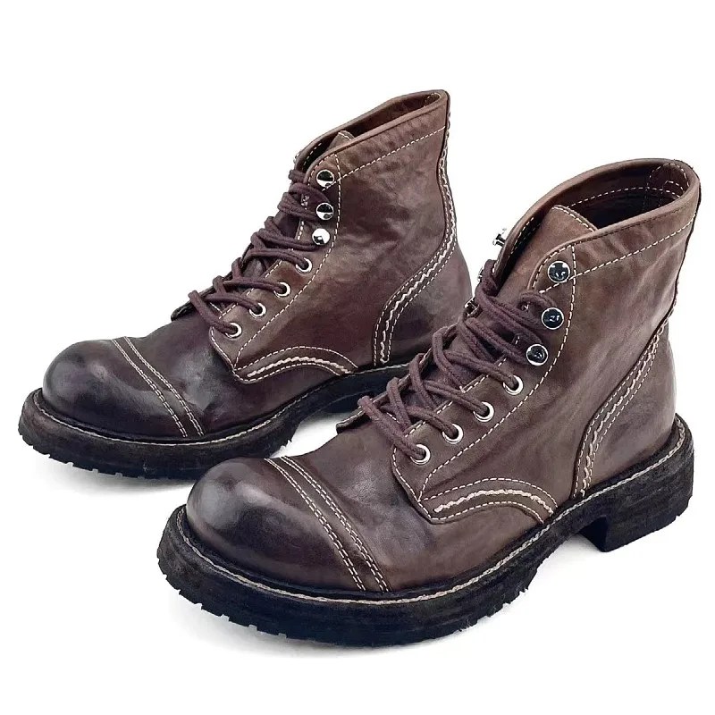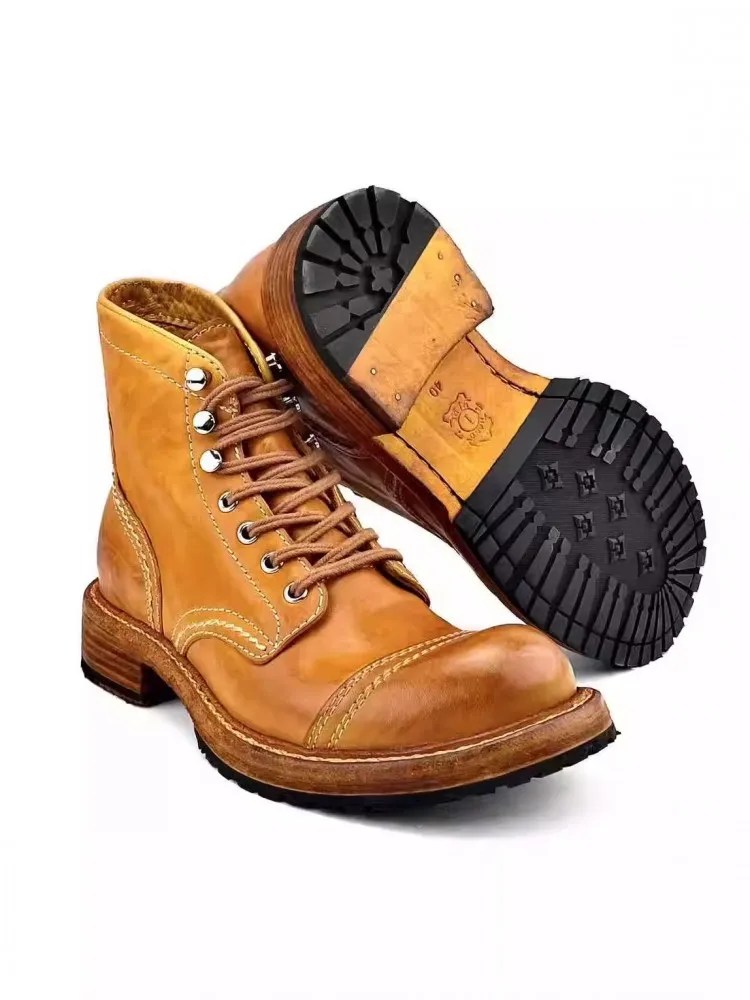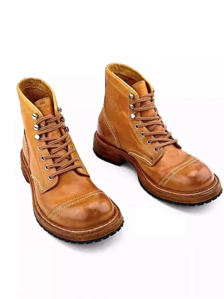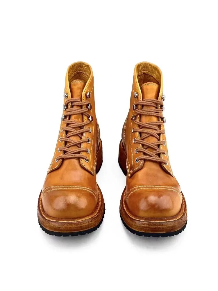 Handmade genuine horsehide motorcycle boots with platform sole. Vintage high-top lace-up leather work boots for bold everyday style. Premium craft & durability.