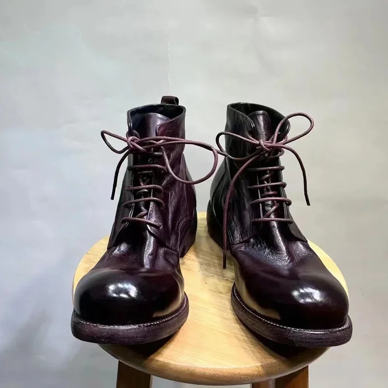 Designed above the ankle with a classic round toe and secure lace-up system, this retro silhouette blends artisanal detail with modern versatility. Every pair is handmade, meaning no two boots are identical, each one holds its own unique texture, shade, and personality.