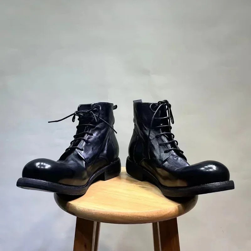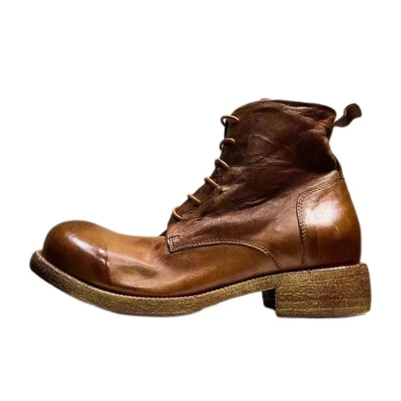 Discover the UNITYPUREMAX™ Washed Retro Horse Leather High-Top Boots, handmade with Goodyear-welt construction, thick rubber soles, and genuine aged leather. Premium vintage motorcycle boots designed for durability, comfort, and timeless style.