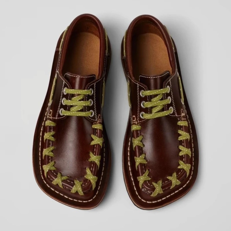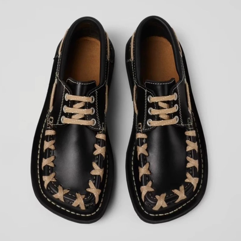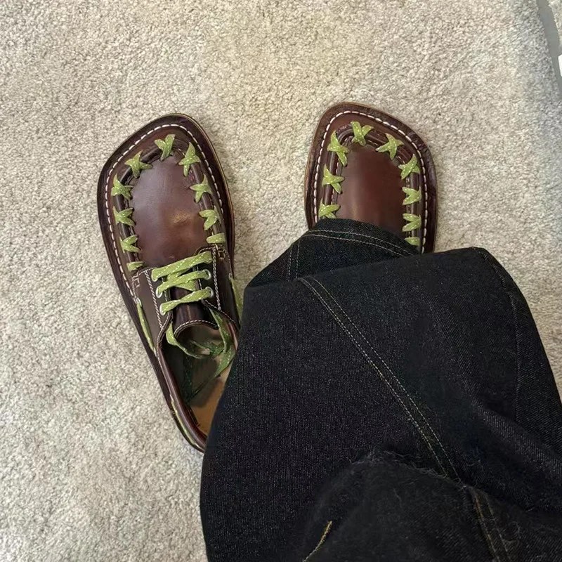 Retro women’s square toe loafers with woven PU upper, lace-up design, and flat sole. Comfortable, waterproof office shoes by UNITYPUREMAX™.