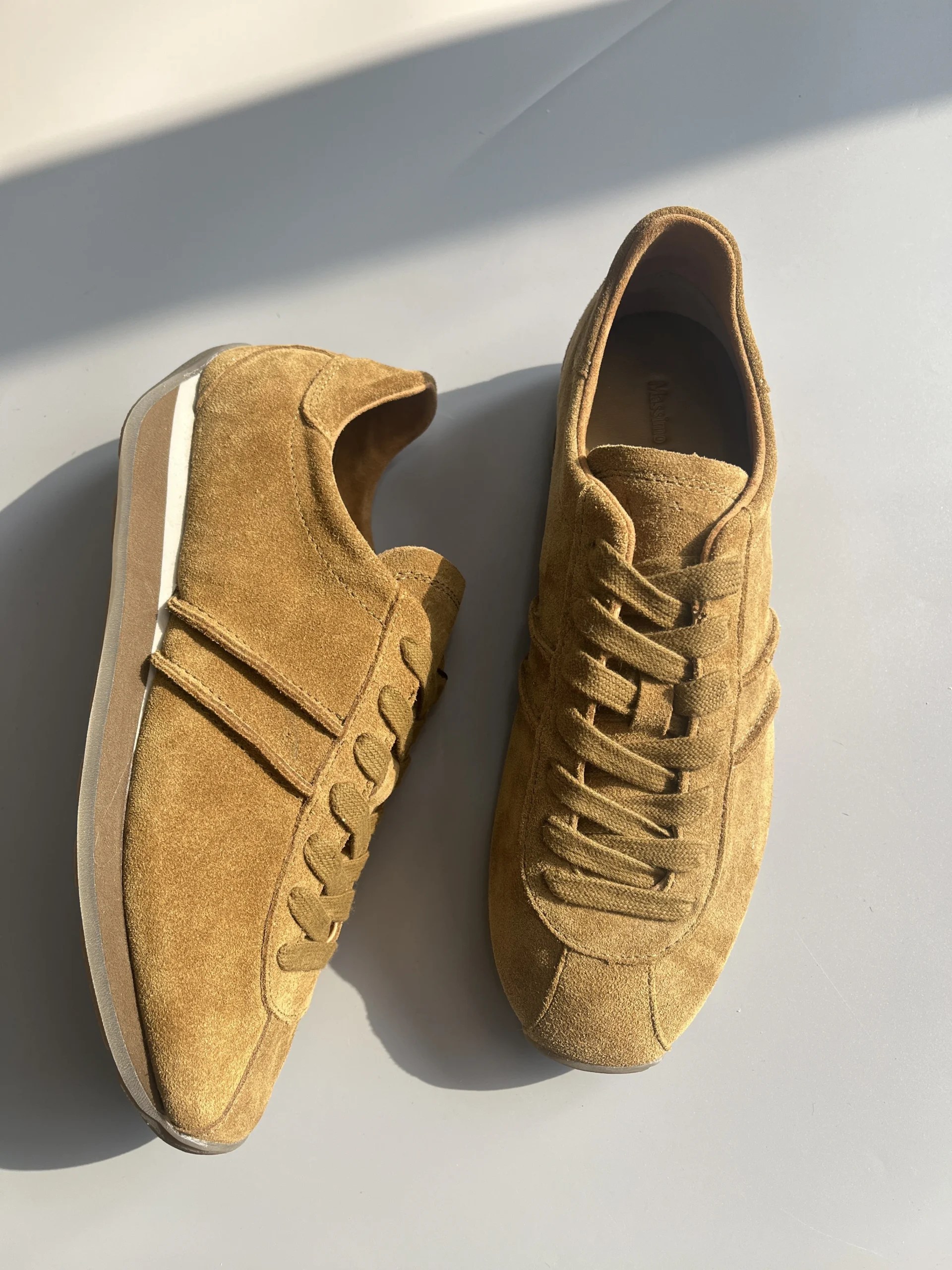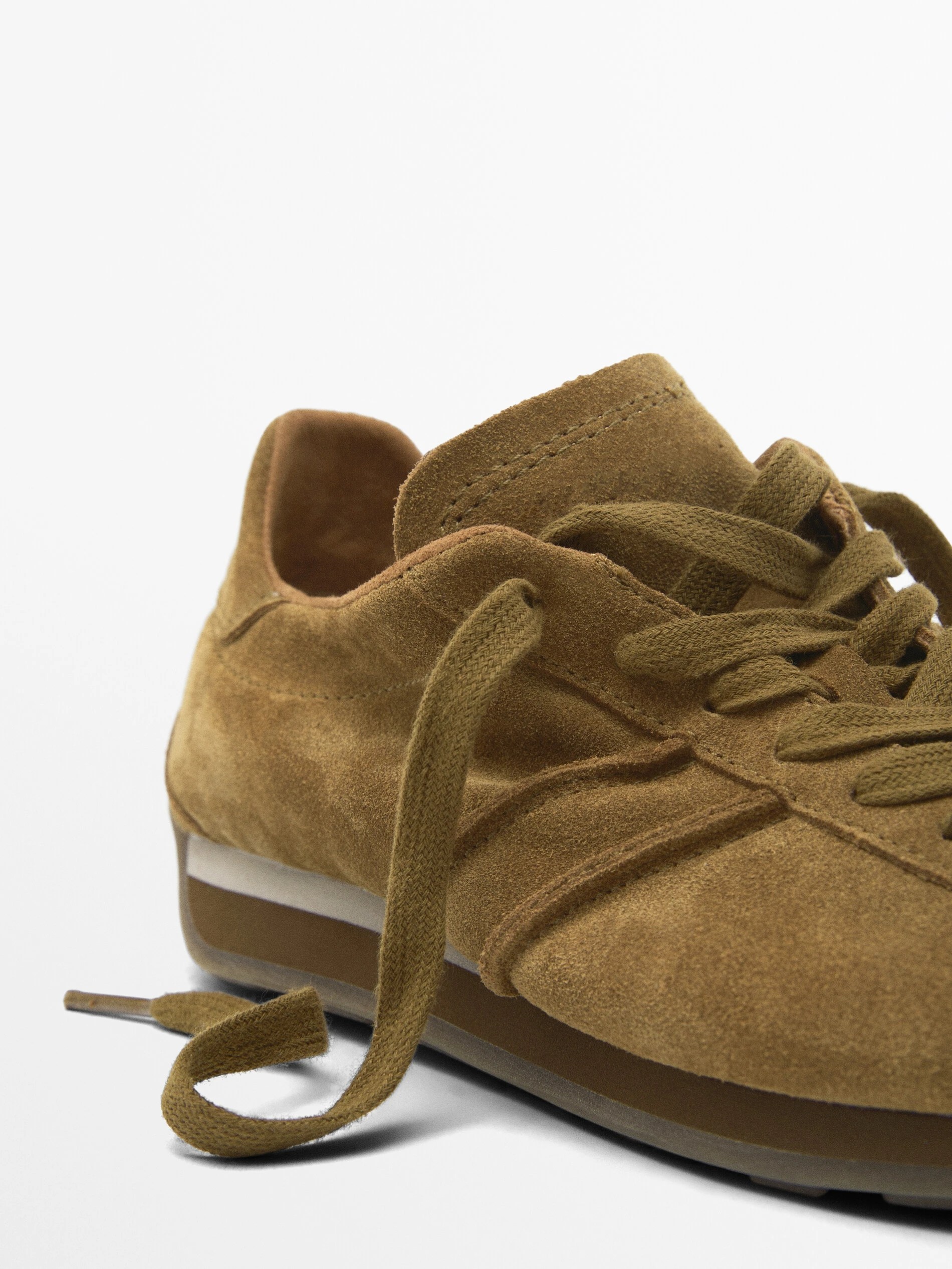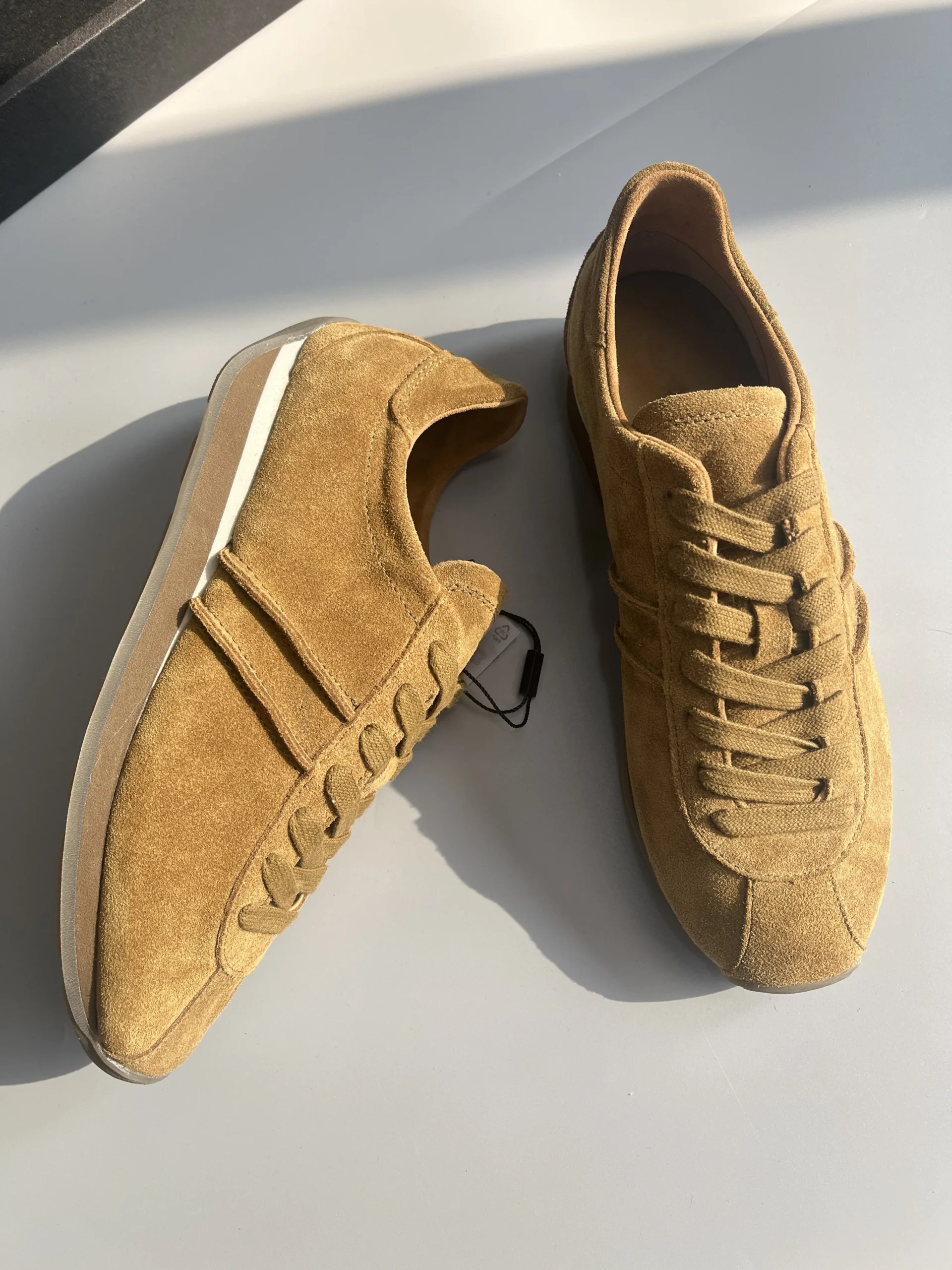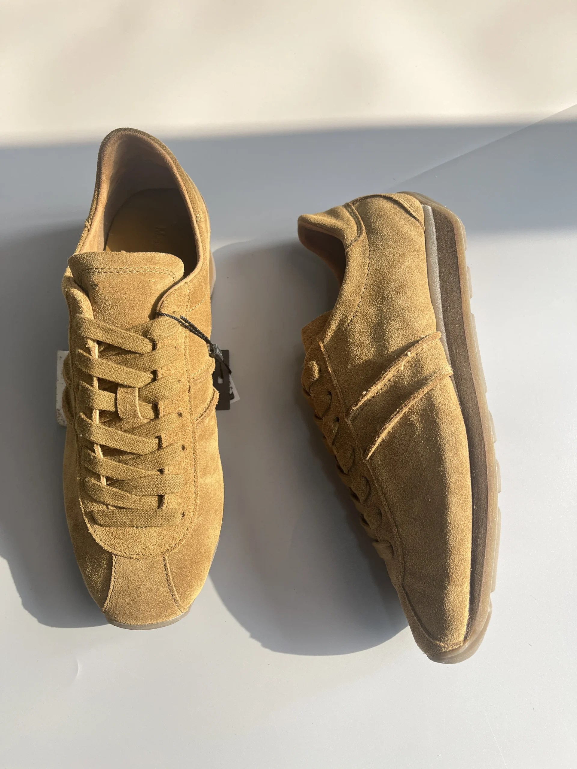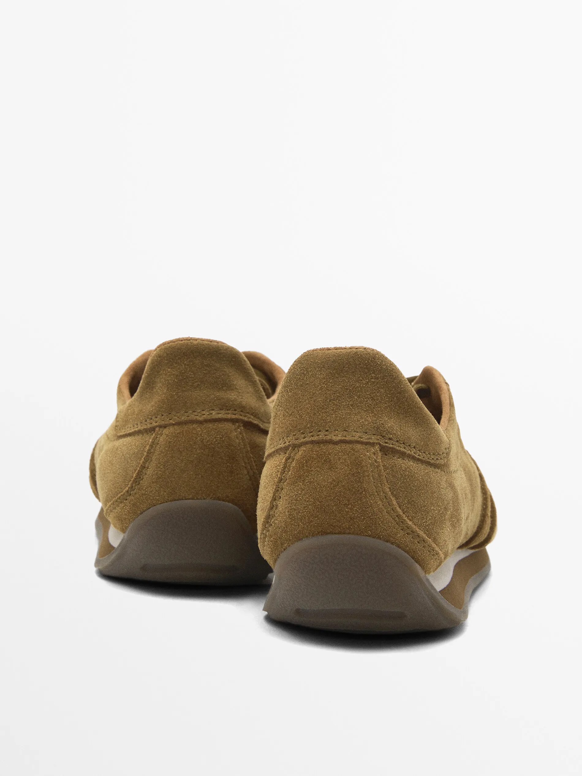 Premium cowhide suede leather upper with soft texture and patchwork detail