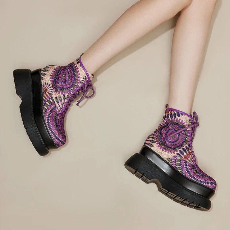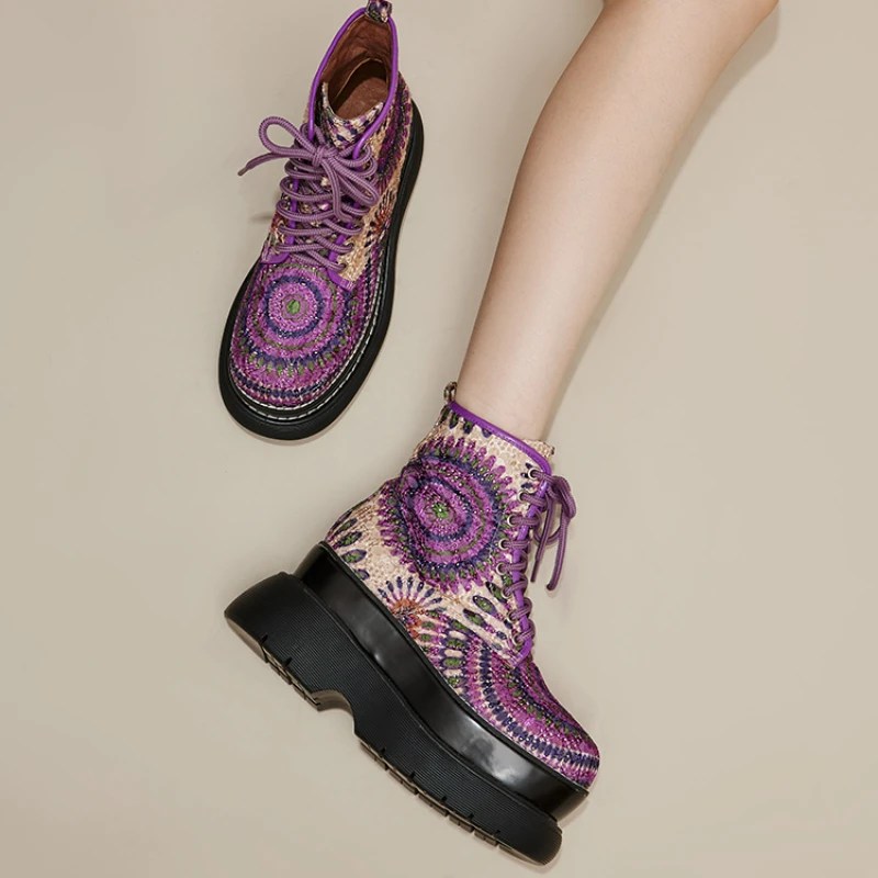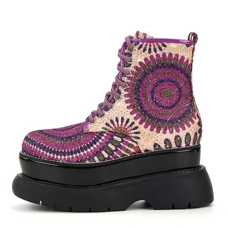 purple fashion boots, women’s height increasing boots, 8cm wedge heels, European street style shoes, handmade exotic pattern boots, UNITYPUREMAX