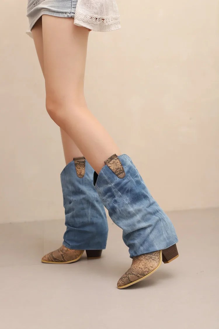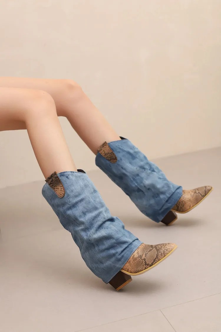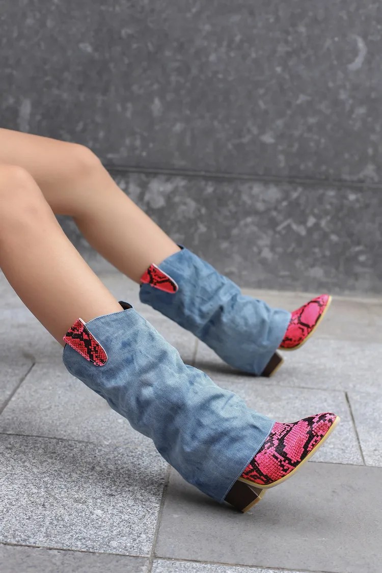 women snake print boots, denim ankle boots women, western ankle boots women, pointed toe cowboy boots women, thick heel ankle boots, platform western boots women, handmade women boots, street style western boots, unitypuremax women shoes