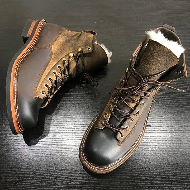 mens leather winter motorcycle boots, wool lined cowhide boots, UNITYPUREMAX handmade boots, warm work cargo boots men, retro cowhide high top shoes, genuine leather winter boots men, cold weather riding boots, vintage patchwork men boots